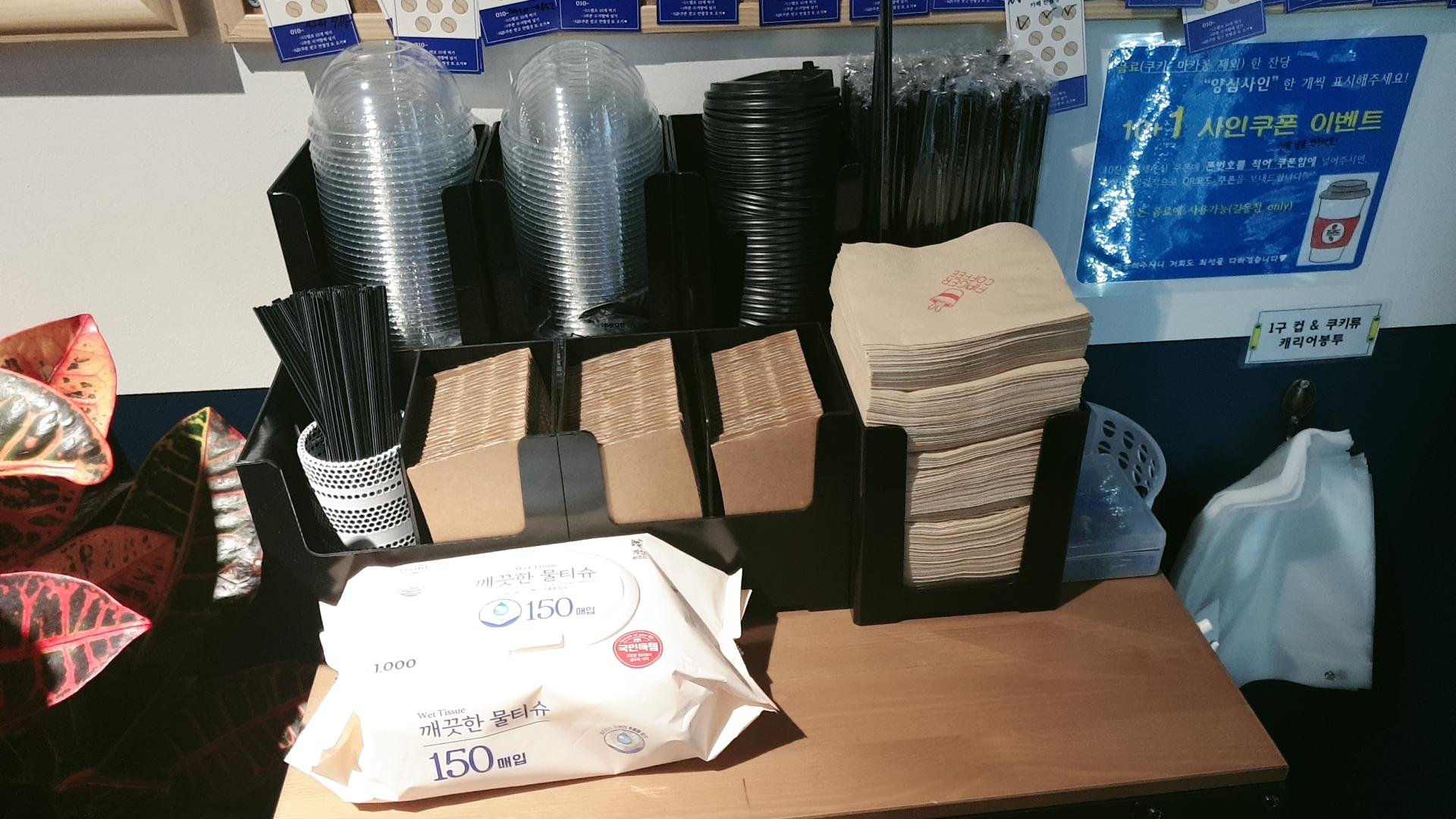 기계 옆에는 이렇게 컵뚜껑, 컵홀더, 빨대가 있다. 그리고 우측에 보이듯 비닐캐리어도 있고, 사진에는 안 나왔지만 아래에는 2인용 이상의 종이캐리어박스도 제공된다.