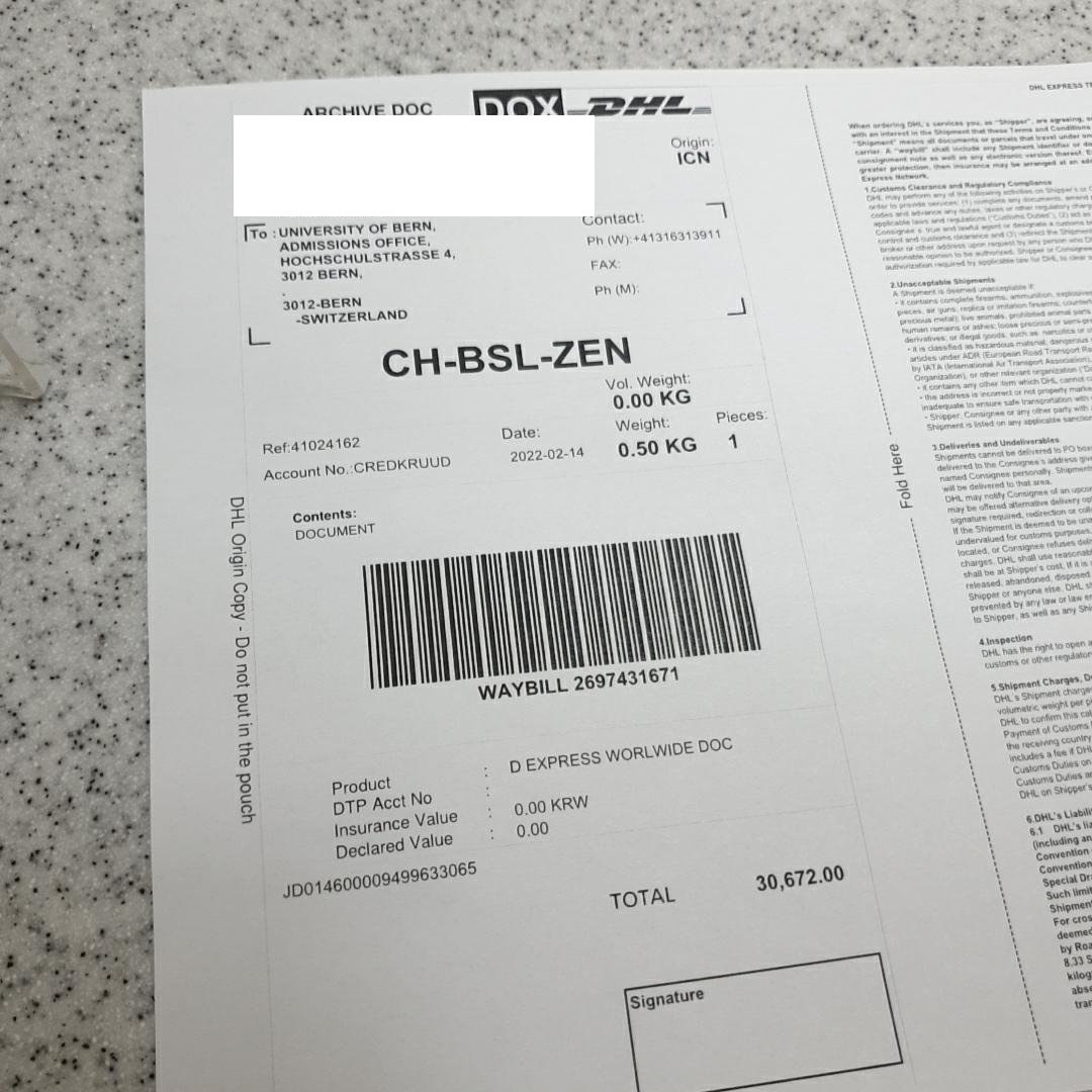 이번에 베른대학을 지원하며 처음으로 DHL을 이용해봤다.