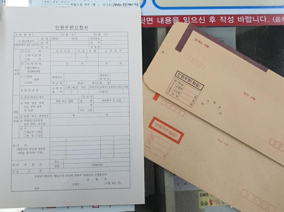 2. 창구에서 민원우편신청서와 민원우편봉투를 받는다. 봉투는 유료(70원)이다.