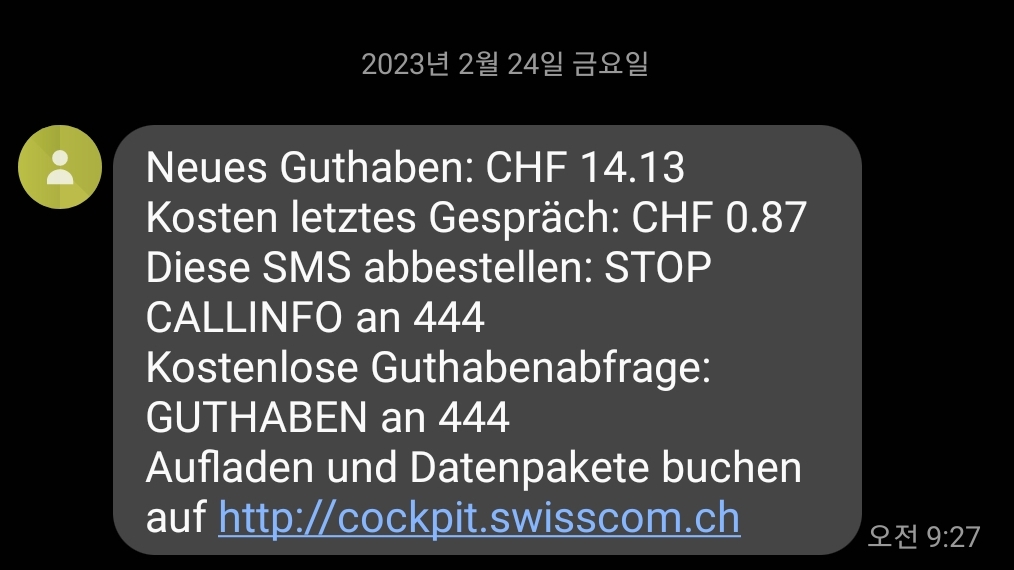 그나마 swisscom에서는 3G 무제한, 문자 무제한, 통화 분당 0.29프랑 요금제를 월 5프랑에 제공하고 있었다.