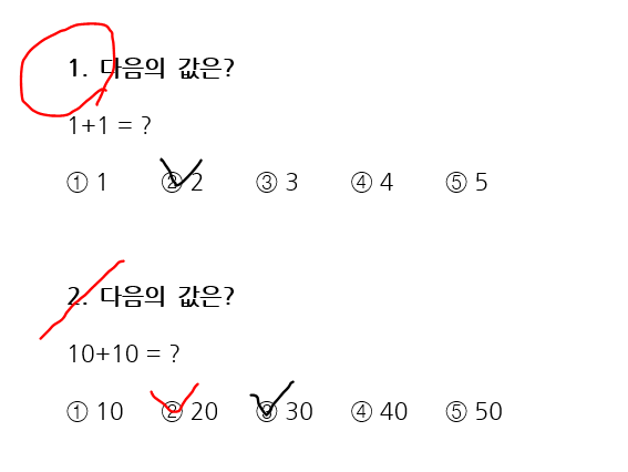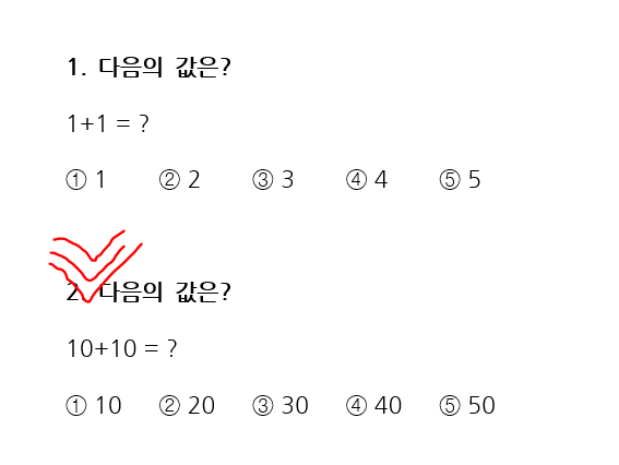 - 문제 번호에 'O, /'로 채점하며 정답을 체크한다.