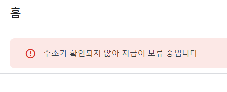더불어 애드센스 사이트에 들어가도 "주소가 확인되지 않아 지급이 보류 중입니다"라는 경고문구가 보였다. (사실 이게 아니어도 지급 받을 금액은 아직 안 됐다 ㅇㅅㅇ)